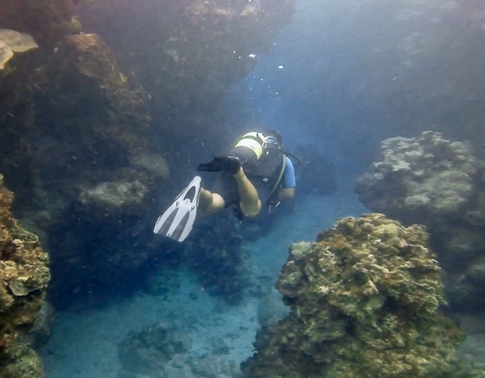 The second dive is organized on a coral beach. We prepare our equipment for a dive straight from the shore under an already radiant sun. The dive site is in shallow waters, allowing us to contemplate underwater colours in full splendour. It’s a very calm and soothing dive that makes us want to go back.
