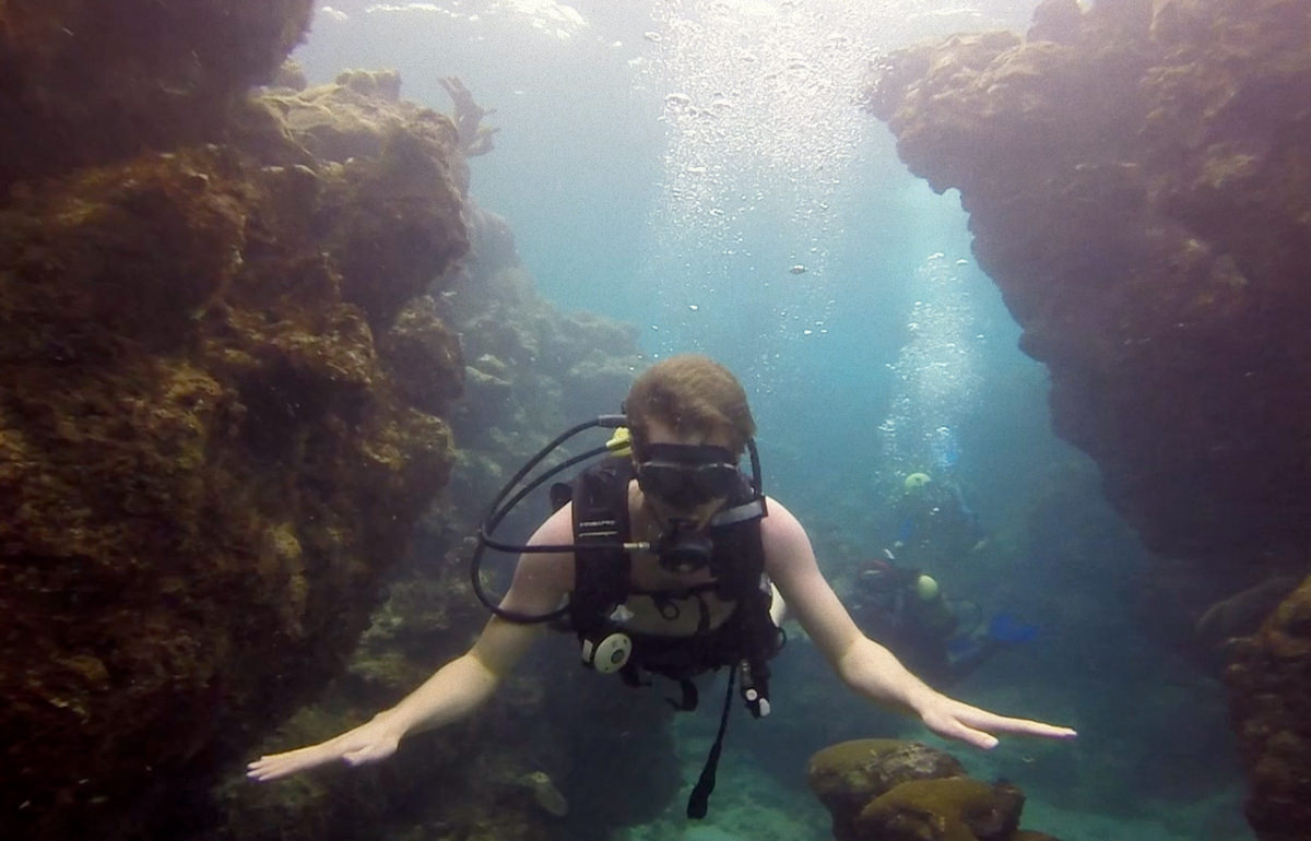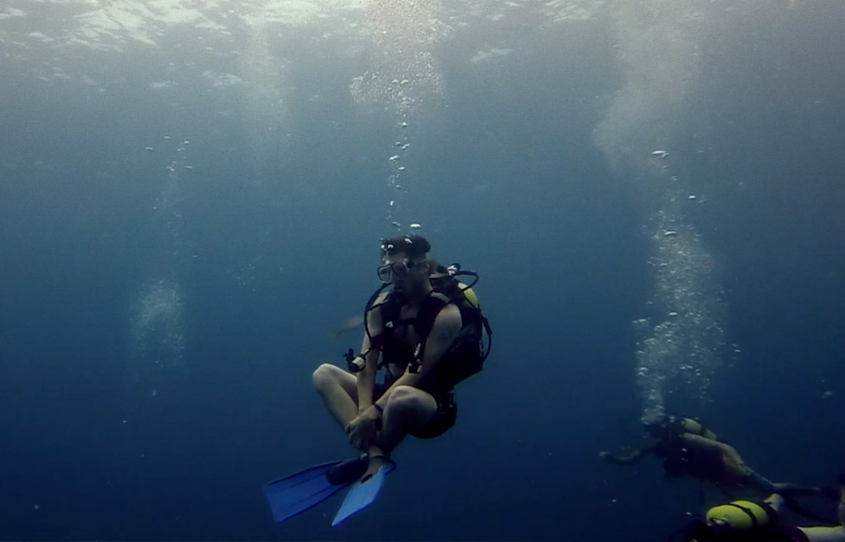 The second dive is organized on a coral beach. We prepare our equipment for a dive straight from the shore under an already radiant sun. The dive site is in shallow waters, allowing us to contemplate underwater colours in full splendour. It’s a very calm and soothing dive that makes us want to go back.